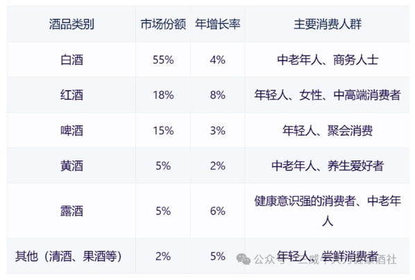 其他酒品:包括清酒、、、、果酒等在内的其他酒品市场份额虽小,,,但增长速度较快。。这些酒品以其独特的口感和尝鲜性质吸引了一部分年轻消费者。。。